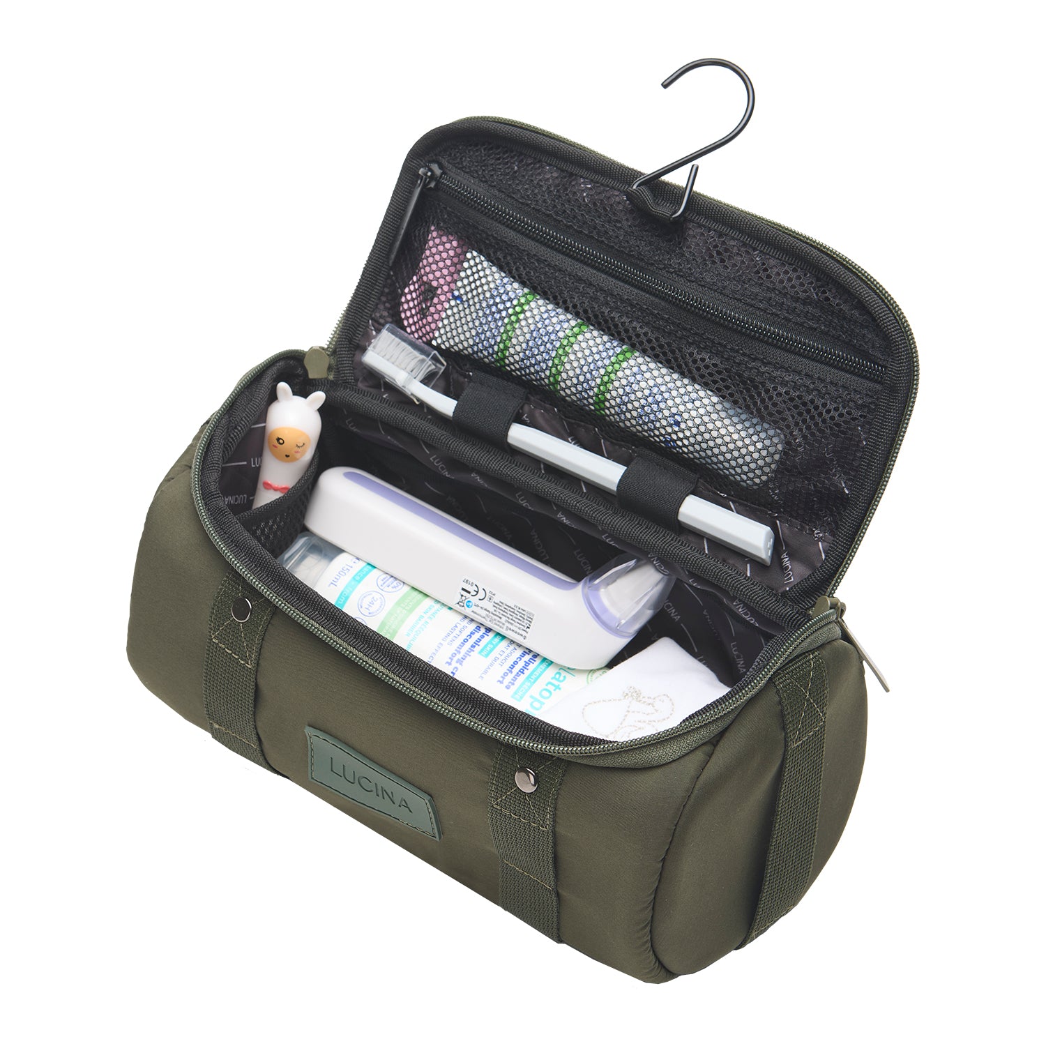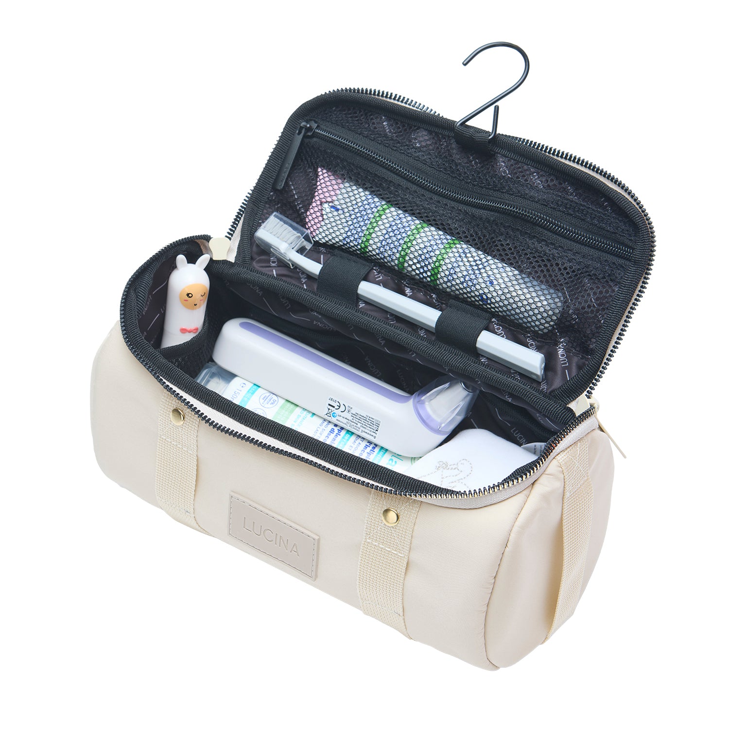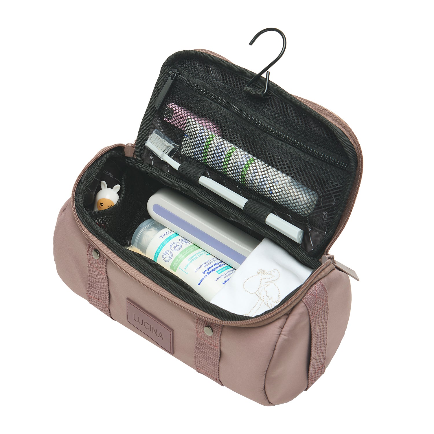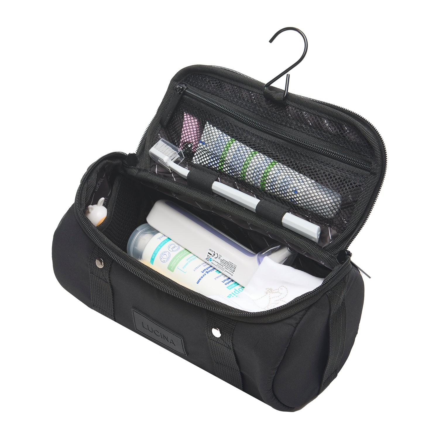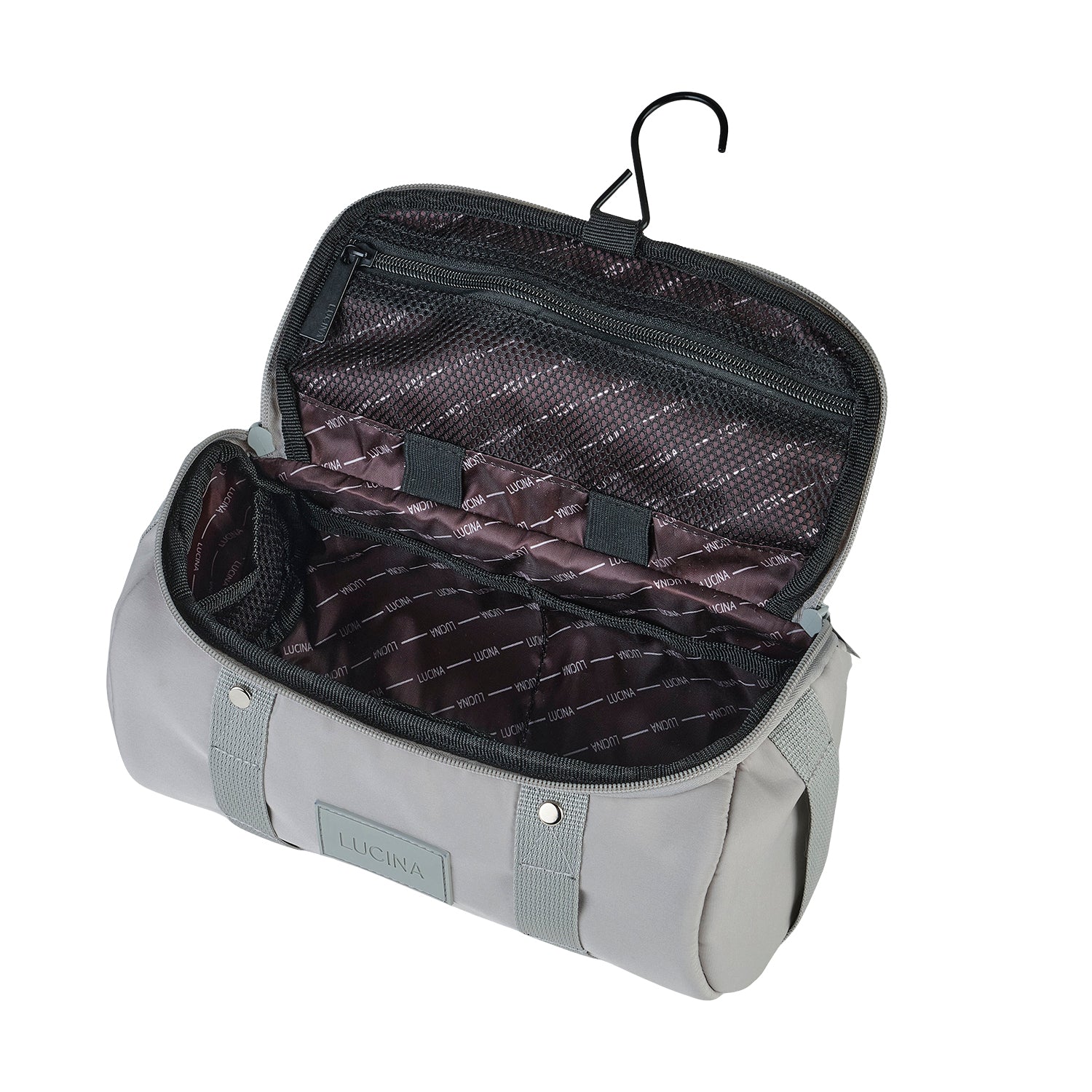 • İçerisinde 3 elastik file cep, 1 fermuarlı file cep, 2 astar cep, diş fırçanız için sabitleme lastikleri ve askı kancası bulunur.
